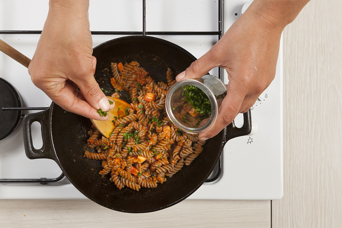 Agrega el perejil picado después de saltear la pasta en una sartén, de este modo seguirá siendo  de color verde y no se oscurecerá cuando se cocine.