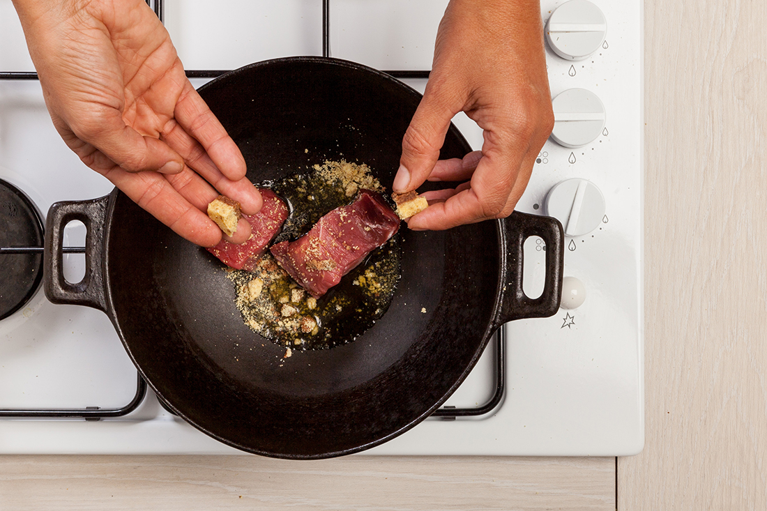 Dora la pechuga de pato en un wok caliente, desmenuzando la pastilla de Avecrem directamente y según la cantidad que quieras. Como la pastilla se deshace con facilidad es más sencilla de dosificar.
