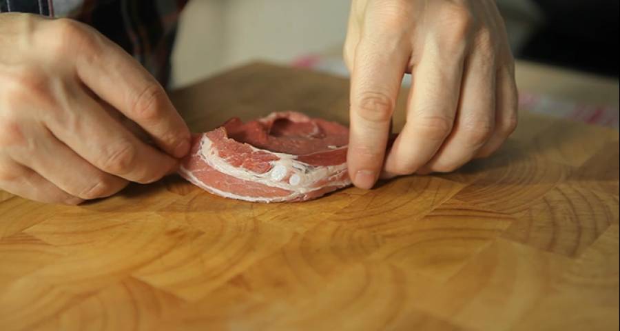 Para dar un toque especial a tu plato, enrolla alrededor de cada trozo de carne una loncha fina de bacón ahumado o de panceta ibérica. Átala con un hilo de bramante o, simplemente, pincha sus extremos a la carne con un palillo. Para que no queden crudos, dora el bacón o el tocino junto con la carne en la sartén, o bien prueba a darle un punto de cocción en el horno. ¡Delicioso!