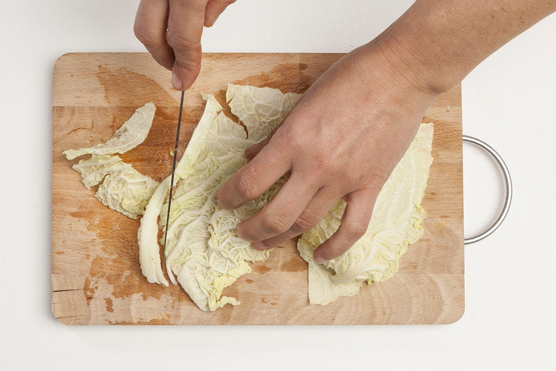 Elimina el tronco duro de las hojas de col antes de utilizarlas para la preparación de los rollitos de pollo, lo que reducirá el tiempo de cocción de la receta.