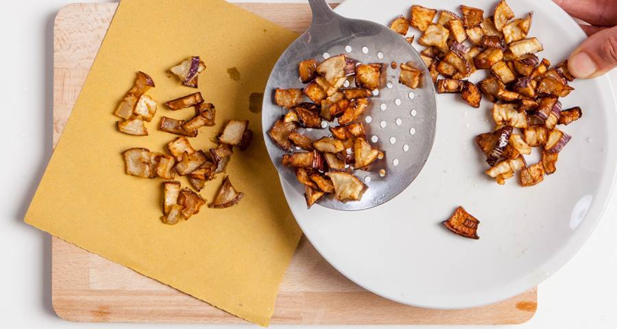 Si vas a freír la berenjenas y quieres que te queden crujientes por fuera y jugosas por dentro, córtalas en dados pequeños antes de freírlas en aceite de oliva virgen extra. ¡Verás lo buenas que quedan!
