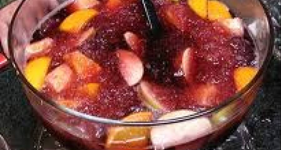 En un cuenco de cristal grande pon las frutas, añade un litro de vino tinto, una fanta naranja y una copa de cointreau, déjalo en reposo en la nevera, despues cuela y tienes una rica sangría y una macedonia.