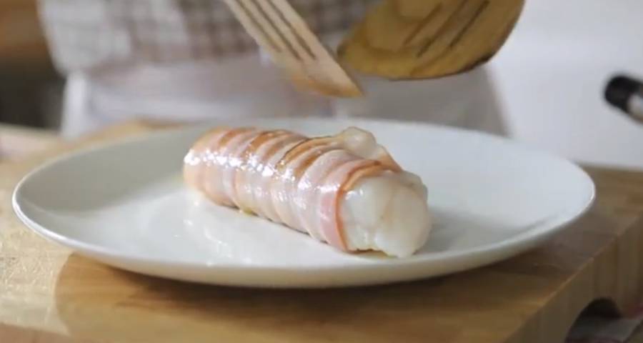 Para dar un toque al plato, puedes albardar los filetes de rape con un poco de bacón o de panceta ibérica: córtalos en lonchas muy finas y enróllalas alrededor del filete del pescado ligeramente superpuestas entre sí. Luego, procede a cocer el rape como se indica en la receta, pero sin enharinarlo. Cuando vayas a cambiar el rape de recipiente, ten cuidado con el envoltorio, que puede soltarse con facilidad.