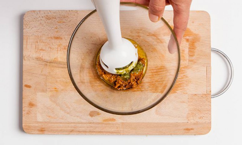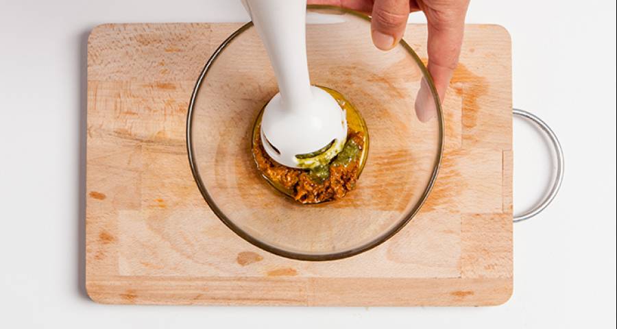 Una forma de dar un toque distinto a la salsa pesto es añadirle tomates deshidratados. Para que sean más fáciles de triturar con el resto de ingredientes, hidrátalos con agua caliente. Este simple procedimiento hará que tu salsa sea más suave y sabrosa.