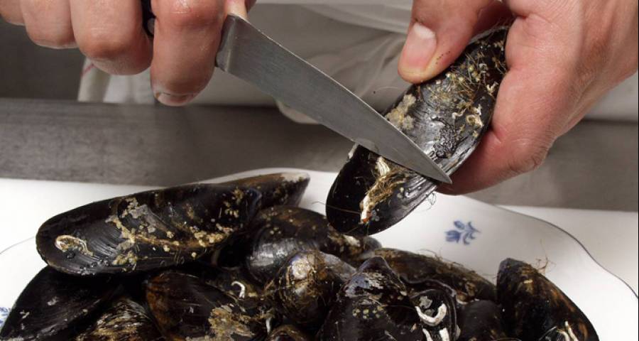 Puedes limpiar los mejillones con la ayuda de un cuchillo. Sirviéndote de él, retira todas las barbas, lapas y restos de roca que tengan en la cáscara. Luego sácales las barbas que salen del interior y límpialos con agua fría. Si además utilizas un estropajo de aluminio, ¡quedarán limpios al momento!