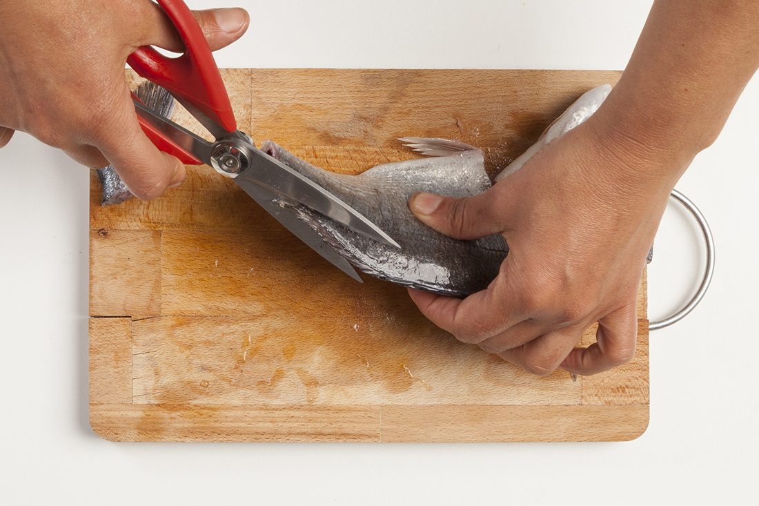 Antes de poner la dorada en el horno debes limpiarla bien. Para ello, utiliza tijeras de cocina y eliminarás de una forma más fácil las aletas y la cola.