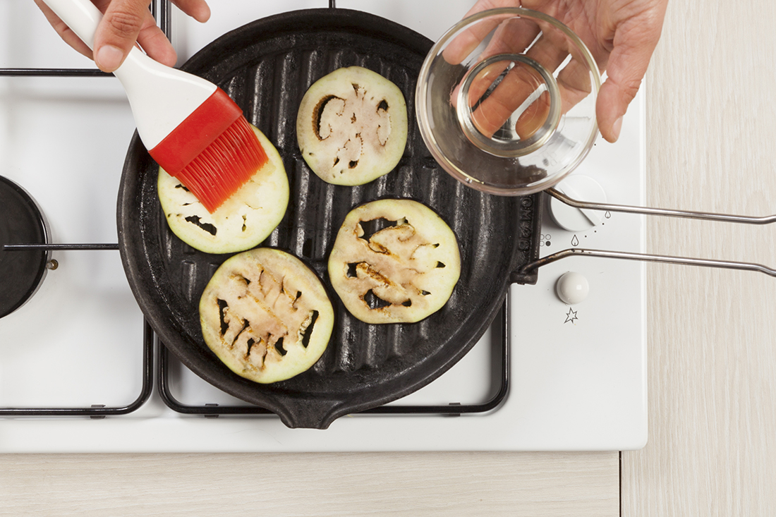 Cepilla con aceite las rodajas de berenjena por ambos ambos lados. De este modo quedarán rodajas mucho más sabrosas y a nivel visual mucho más atractivos.