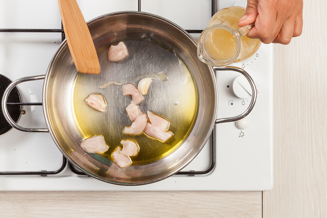 Al cocinar con pollo corremos el riesgo que nos quede demasiado seco, lo que hará que nuestro plato pierda la textura y el sabor deseado. Para evitarlo riégalo con un poco de caldo mientras lo marcas en la sartén. Así quedará mucho más jugoso.