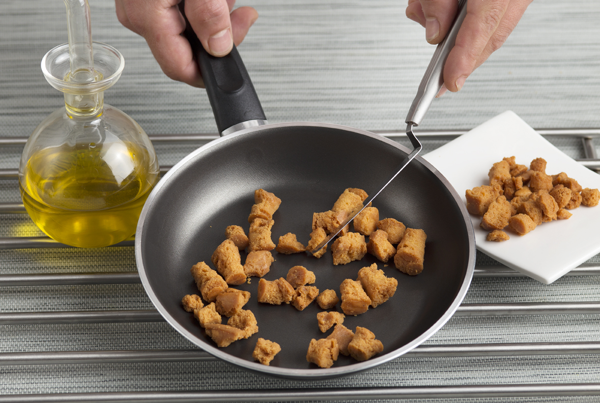 Acompaña esta delicisoa sopa con unos picatostes hechos por ti. Simplemente necesitas una barra de pan precocida. Córtala a lo largo en láminas finas de medio centímetro de grosor aproximadamente. Sazónalas con sal y pimienta, y régalas con aceite de oliva. Después, introducelas en el horno a 175ºC hasta que estén tostadas.