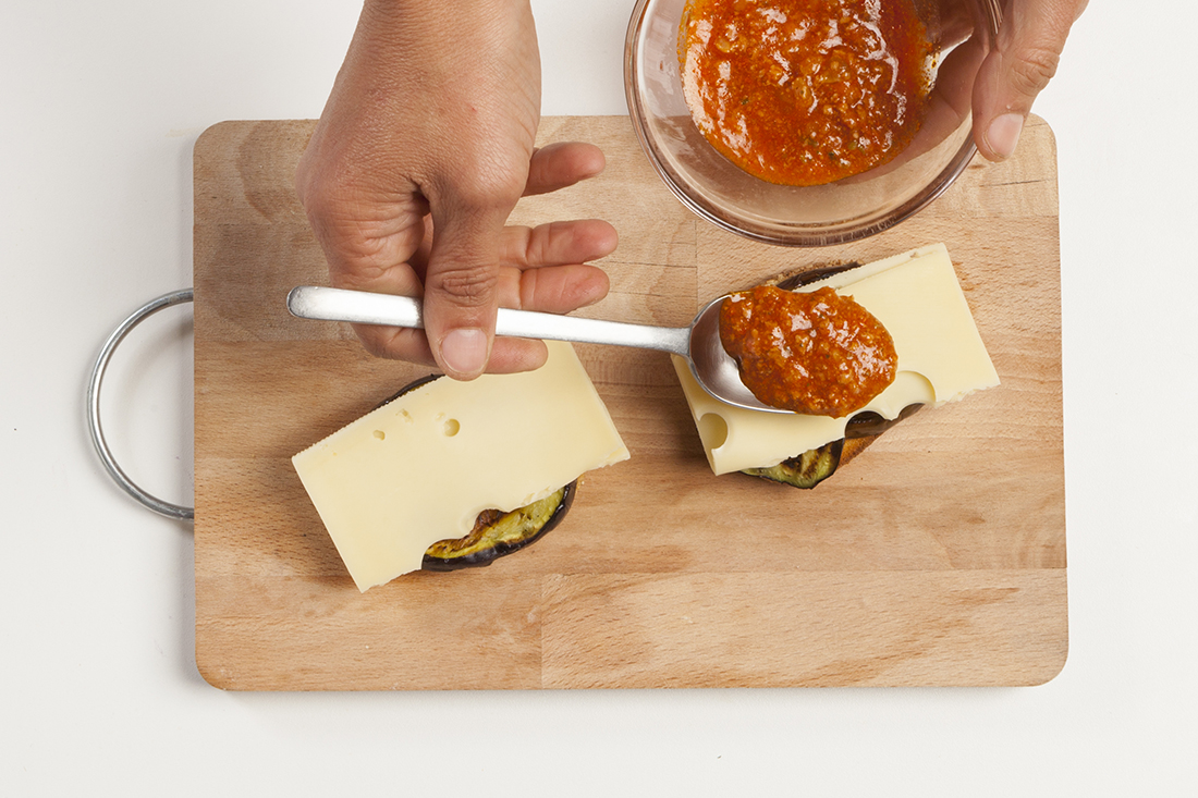 Monta la tostada de berenjena, con el queso y agrega por encima la mezcla de Tomate Frito y la carne picada. De este modo el queso no se secarà y quedarà más suave tras gratinarlo todo en el horno.