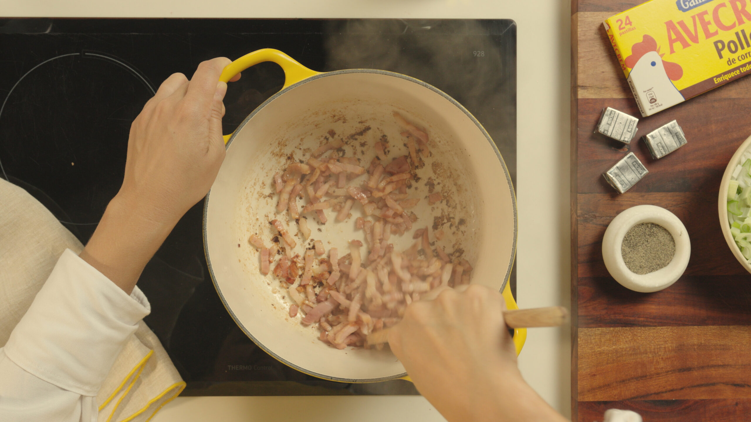 Así, dorar primero el beicon nos ayuda a dar este toque caramelizado y a aportar más sabor al plato.