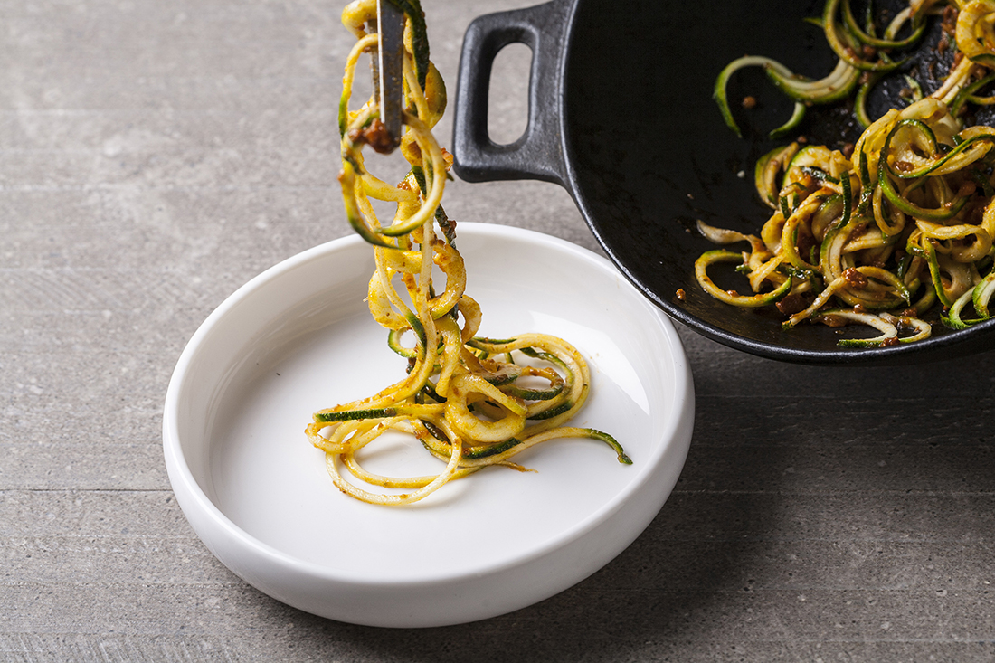 Para conseguir que el plato sea mucho más homogéneo saltea durante unos minutos los espaguetis de calabacín y la salsa hecha previamente con el tomate frito y la carne picada. ¡Verás lo bien que te queda!