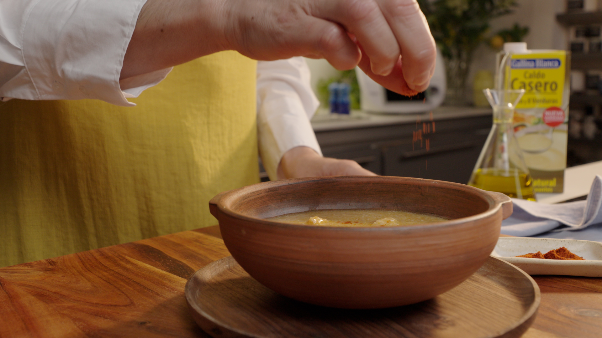 Un consejo para cocinar esta sopa de ajo con thermomix® está en el emplatado final y consiste en darle un toque picante.
